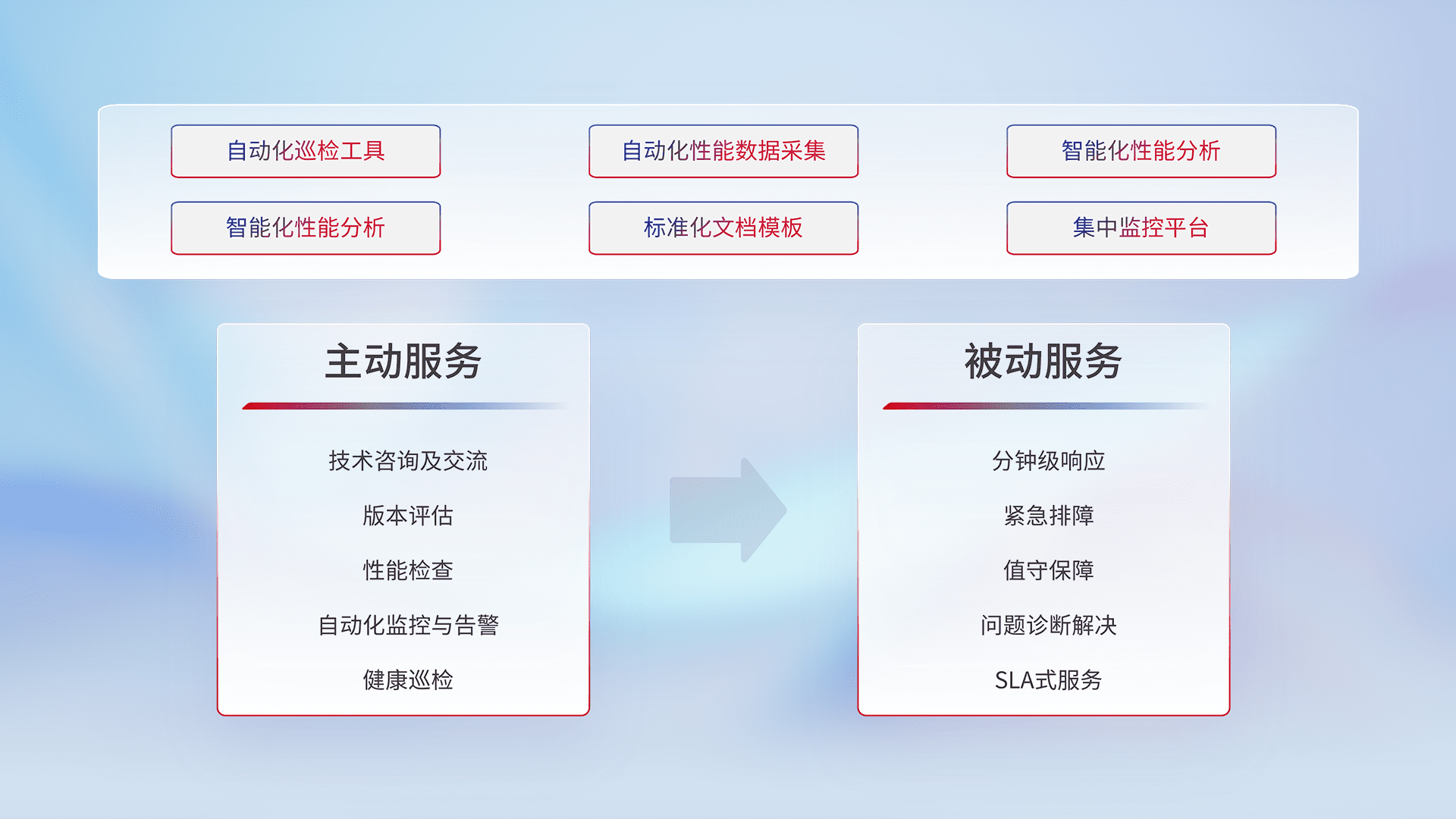 智能化工具和标准化文档,,,保障服务质量,,提供主动服务(包含技术咨询、、、版本评估、、性能检查、、自动化监控与告警、、、、健康巡检)和被动服务包含(分钟级响应、、、紧急排障、、值守保障、、、问题诊断解决、、、SLA服务)。。。。